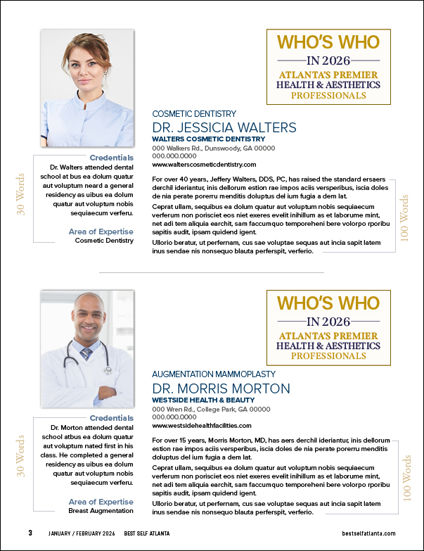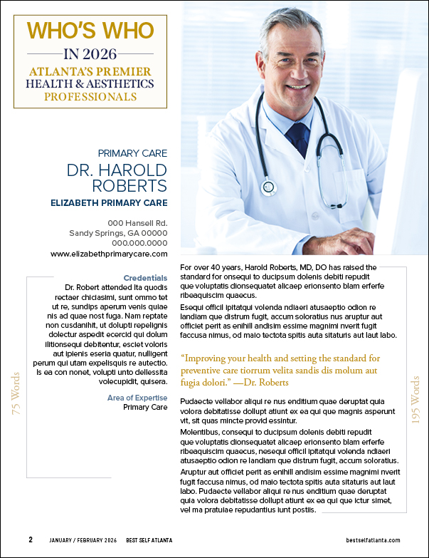 This premium multi-platform option offers a full page professionally written and edited sponsored article that will be showcased in the Jan/Feb issue of Best Self Atlanta and published on bestselfatlanta.com (20,000+ visitors monthly) with SEO and a valuable dofollow link to your website. The Who’s Who in 2026 eblast will be sent out to our email database of 60,000+ linking to the Who’s Who in 2026 landing page, as well as pushed out on our Facebook and Instagram platforms (20,000+) with your business tagged. You will receive a customized badge with your business name prominently displayed for your marketing purposes, a premium plaque customized to recognize your achievement for display at your business, and a cover spotlight with your photo on the print and digital issue!