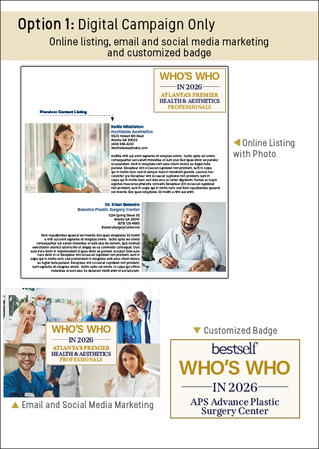 Our professional level option offers a half page professionally written and edited sponsored article that will be showcased in the Jan/Feb issue of Best Self Atlanta and published on bestselfatlanta.com (20,000+ visitors monthly) with SEO and a valuable dofollow link to your website. The Who’s Who in 2026 eblast will be sent out to our email database of 60,000+ linking to the Who’s Who in 2026 landing page, as well as pushed out on our Facebook and Instagram platforms (20,000+) with your business tagged. You will receive a customized badge with your business name prominently displayed for your marketing purposes.